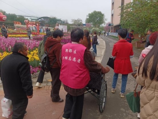 活动当天,10名志愿者全程陪伴与辅助,陪伴服务对象开启春日疗愈之行。从集合出发到乘车往返,从园区漫步到休憩交流,社工与志愿者分工协作、密切配合,摒弃全程代劳的传统照护模式,以鼓励、引导、协助的方式激发服务对象自主行动意愿。针对行动不便的重度残疾人,社工提供专业搀扶与安全指导,志愿者同步做好随行辅助、物品照看、路线引导等工作,鼓励服务对象借助辅助器具与家属协助自主移动,在地形略有变化的花海步道中完成从被动休养到主动探索的转变,激活长期居家钝化的肢体机能与感官知觉。自然环境中的阳光、绿植、花香,为服务对象带来多维度感官刺激,调节紊乱生物钟、改善睡眠与代谢,实现身体机能的温和激活与重建。社工引导服务对象自主选择观赏路线、决定停留时长,让长期处于被动照护状态的特殊群体在微小决策中重拾掌控感,打破习得性无助,逐步重建自我效能感与自信心。
