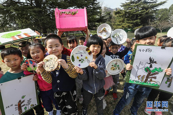 3月30日,小朋友在中国儿童中心内用彩笔和树枝树叶等材料“画春天”。